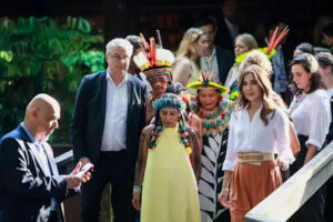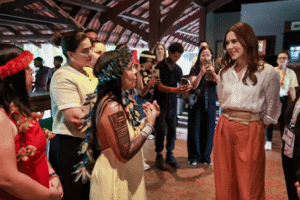 Encantada com a visita, a rainha acompanhou uma apresentação cultural realizada por indígenas da etnia Tembé, que compartilharam danças, cânticos e narrativas sobre sua história e ancestralidade. O momento foi marcado por emoção e reconhecimento à trajetória de resistência dos povos originários da Amazônia, especialmente das mulheres que mantêm viva a herança cultural e espiritual de suas comunidades.