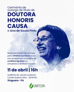 A sociologa Ana de Sousa, (aninha da CPT), recebeu o titulo de Honoris Causa, oferecido pela Universidade do Sul e Sudeste do Pará (UNIFESSPA), em reconhecimento pelos trabalhos prestados, especialmente na Região do Araguaia Paraense.